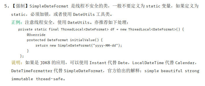 在阿里Java开发规约中,有强制性的提到SimpleDateFormat 是线程不安全的类 ,在使用的时候应当注意线程安全问题,如下: