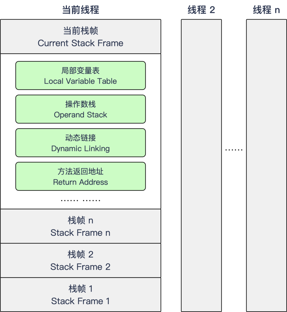 每一个栈帧都包括了局部变量表、操作数栈、动态链接、方法返回地址和一些额外的附加信息。在编译程序代码时,栈帧中需要多大的局部变量表,多深的操作数栈都已经完全确定了,并且写入到方法表的 Code 属性之中,因此一个栈帧需要分配多少内存,不会受到程序运行期变量数据的影响,而仅仅取决于具体的虚拟机实现。
