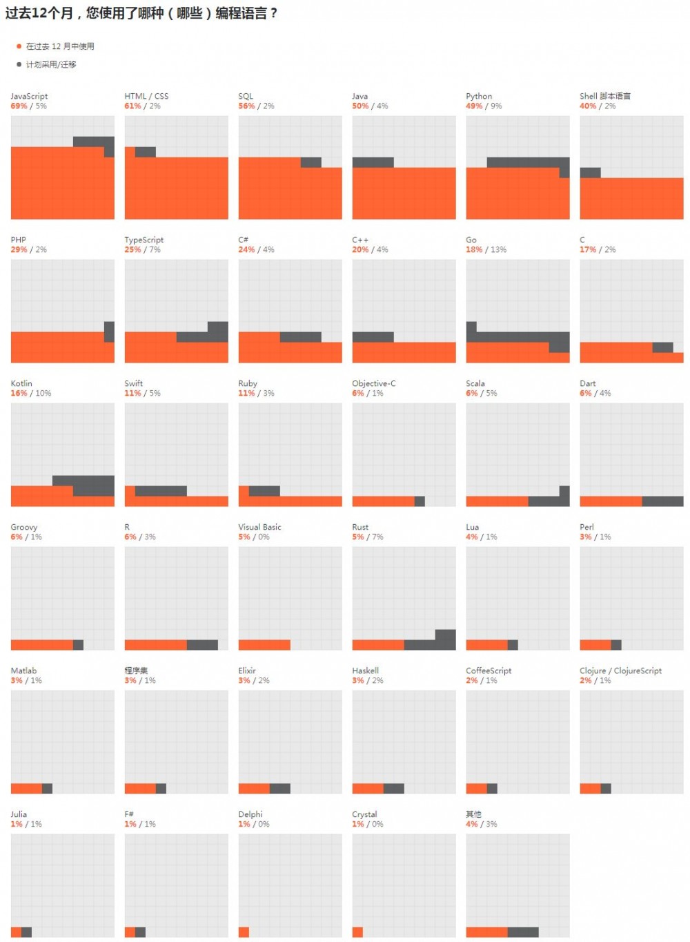 有一些语言主要起“辅助”作用,包括 HTML、SQL 和 Shell 脚本语言。很多软件开发人员练习过这些辅助语言,但很少有人将它们作为主要语言。例如,56% 的人练习过 SQL,但只有 19% 的人称它为主要语言,仅 1.5% 的人将它作为第一语言。从另一方面看,Java 是独占鳌头的语言,其用户中有 44% 只使用或首先使用 Java。其后是 JavaScript,份额“仅有” 17%。