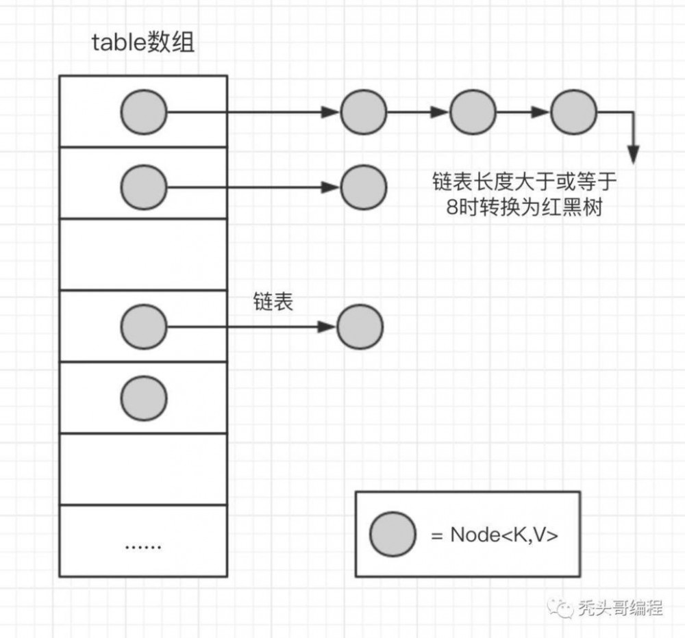 为了解决碰撞,数组中的元素是单向链表类型。当链表长度到达一个阈值时(7或8),会将链表转换成红黑树提高性能。而当链表长度缩小到另一个阈值时(6),又会将红黑树转换回单向链表提高性能,这里是一个平衡点。