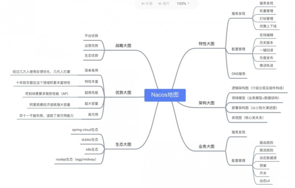 架构大图:通过清晰架构,让您快速进入 Nacos 世界 业务大图:利用当前特性可以支持的业务场景,及其最佳实践 生态大图:系统梳理 Nacos 和主流技术生态的关系 优势大图:展示 Nacos 核心竞争力 战略大图:要从战略到战术层面讲 Nacos 的宏观优势