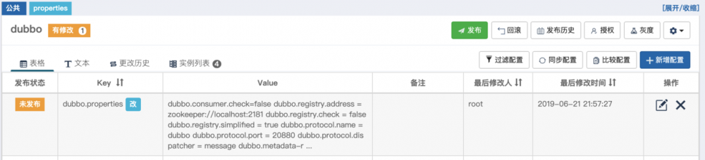 app.id = 100001 # 可选 apollo.meta=http://config-service-url # 开启apollo名空间的自动注入,缺省注入application apollo.bootstrap.enabled = true # 如果要引入其他的namespaces 则配置 # apollo.bootstrap.namespaces = application,javaConfig # dubbo 配置中心地址 dubbo.config-center.address= apollo://39.106.170.184:8080 # dubbo namespace 缺省为dubbo dubbo.config-center.namespaces = dubbo # 配置中心的配置覆盖本地配置 dubbo.config-center.highest-priority = false # 全局级配置文件所映射到的key # zookeeper - 默认路径/dubbo/config/dubbo/dubbo.properties # apollo - dubbo namespace中的dubbo.properties键 dubbo.config-center.config-file = dubbo.properties 复制代码