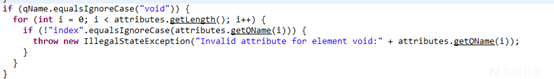 遍历 void 标签的属性,只要存在不是 index 的属性名,就会抛错,无法进行下一步 XMLDecoder 解析