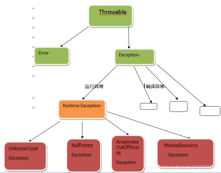 表示无效,不是程序中可以预测的。比如无效的用户输入,文件不存在,网络或者数据库链接错误。这些都是外在的原因,都不是程序内部可以控制的。 必须在代码中显式地处理。比如try-catch块处理,或者给所在的方法加上throws说明,将异常抛到调用栈的上一层。 继承自java.lang.Exception(java.lang.RuntimeException除外)。