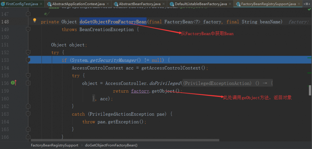 FactoryBean 类型,如果是该类型的,调用getObject方法返回对象即可。 org.springframework.beans.factory.support.FactoryBeanRegistrySupport#doGetObjectFromFactoryBean 方法