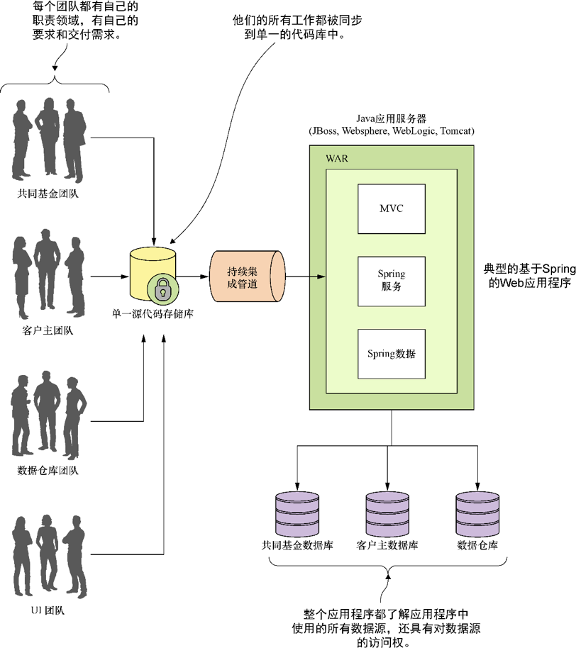 开发相互干扰,随着应用的不断升级沟通协调成本增加 应用上线由于某个功能升级导致需要整体的构建、整体测试、整体发布