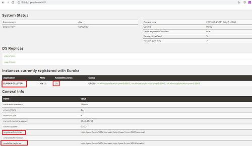 eureka.environment 是表示当前的运行环境,在页面Environment会展示出来 eureka.datacenter 表示当前的数据中心,对于多中心的最好配置一下 eureka.instance.hostname 表示当前实例的主机名, 主机名不能相同,不然副本模式会无法生效!!!在页面上就一直显示为 unavailable-replicas ,即便是单机多个实例最好配置多个不同域名,否则无法工作。 eureka.instance.appname 对于多副本的实例,需要配置相同的名字,不然副本模式会无法正常工作。 然后,我们依次启动三个实例