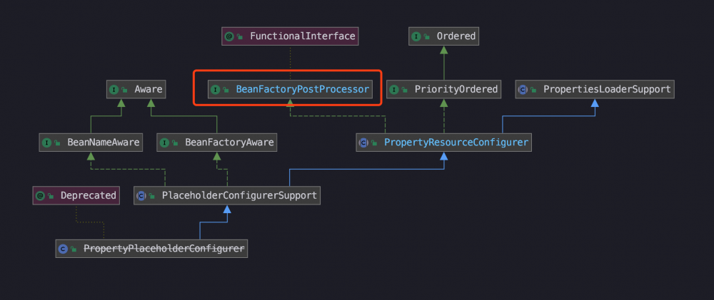 PropertyPlaceholderConfigurer 已经打上了不建议使用的标志 @Deprecated ,看了文件注释,提示我们去使用 Environment 来设置属性,但我觉得这个后处理器的思想是一样的,所以还是拿它作为例子进行熟悉。 先来看下它的继承体系: