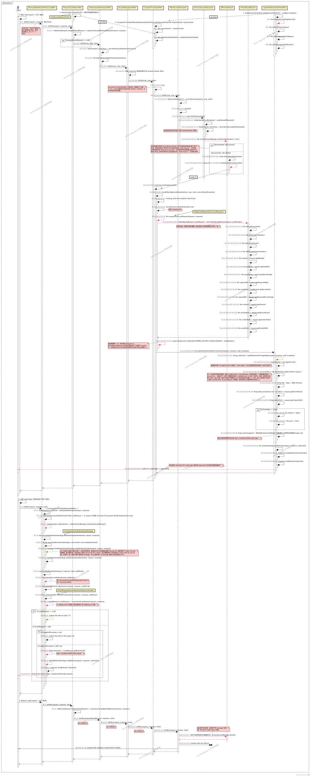然后,该异常 AccessDeniedException 将会被 ExceptionTranslationFilter 的 catch 异常的模块所捕获,见步骤 3.1.1.2.3.2.3,该处理流程中,两个步骤非常关键,