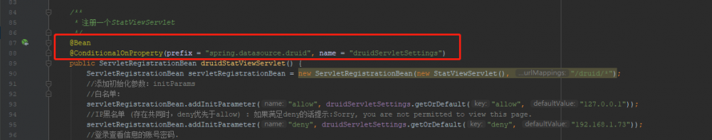 在这里是判断来自所有属性源配置的属性中,是否包含条件注解指定的属性,即 spring.datasource.druid.druidServletSettings ,由上图可见, spring.datasource.druid.druidServletSettings 只是某些属性的前缀,并不存在完全匹配的属性,因此返回false,导致条件不满足。回看注解@ConditionOnProperty的javadoc,