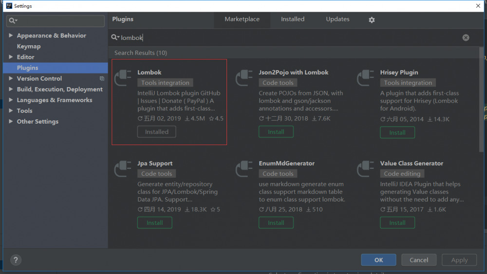 2.搜索插件仓库,安装插件lombok