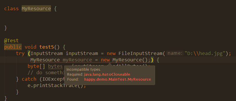 如,自定义一个类MyResource,定义在括号内则会报错:提示需要java.lang.AutoCloseable的类。