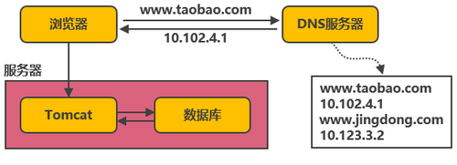 以淘宝作为例子。在网站最初时,应用数量与用户数都较少,可以把Tomcat和数据库部署在同一台服务器上。浏览器往 www.taobao.com 发起请求时,首先经过DNS服务器(域名系统)把域名转换为实际IP地址10.102.4.1,浏览器转而访问该IP对应的Tomcat。