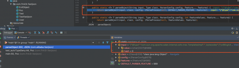 这段代码又重新回到了 com.alibaba.fastjson.parser.DefaultJSONParser 这个类中,并且调用parseObject方法来处理我们传入的数据。