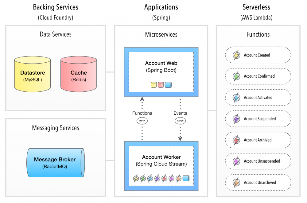 上图详细说明了Accounts的有界上下文的系统体系结构,其中包括每个 Backing Service , Microservice 和 AWS Lambda Function的 可部署单元。