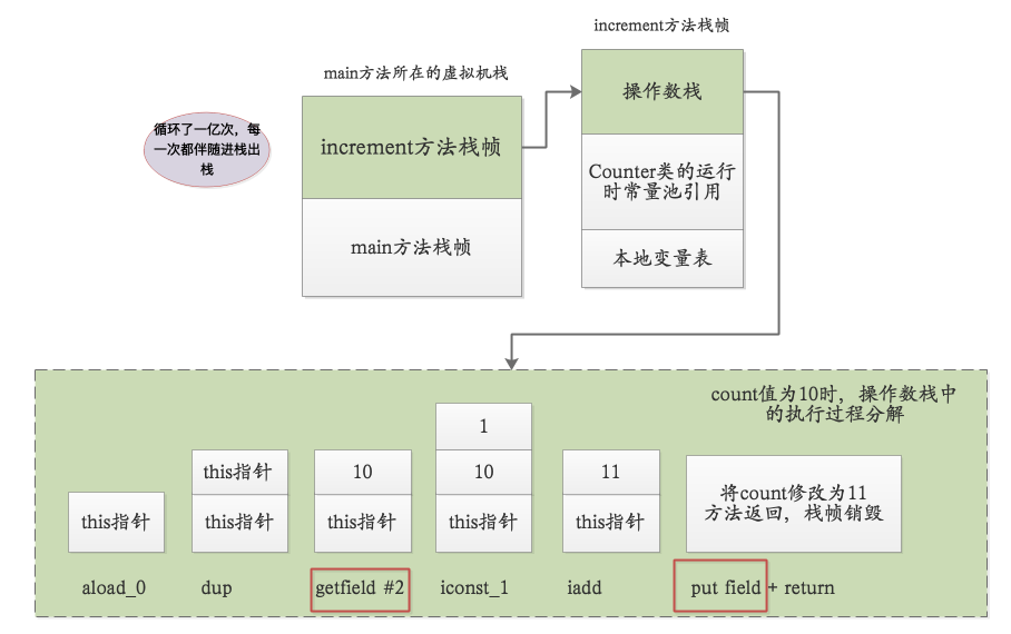 我们知道Java中方法的调用是基于栈帧实现的,每个栈帧中主要包含操作数栈+用到类的运行时常量池引用+本地变量表。我画了一张示意图帮助大家理解整个执行过程,并且将其中一次count++操作的字节码在操作数栈中的执行步骤分解了(以count=10为例), 这里要注意,下面这张图的运行是在工作内存中(main方法所在线程的虚拟机栈中) 。