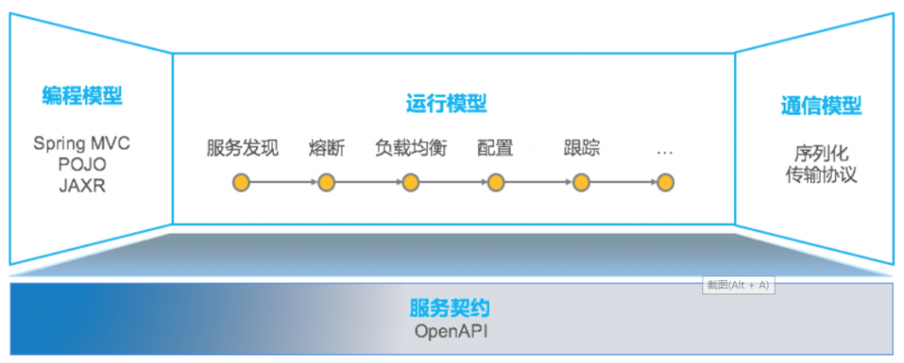ServiceComb主要包含的是Java底座(Chassis),整个语言开发包包含服务契约、编程模型、运行模型与通信模型四个部分。