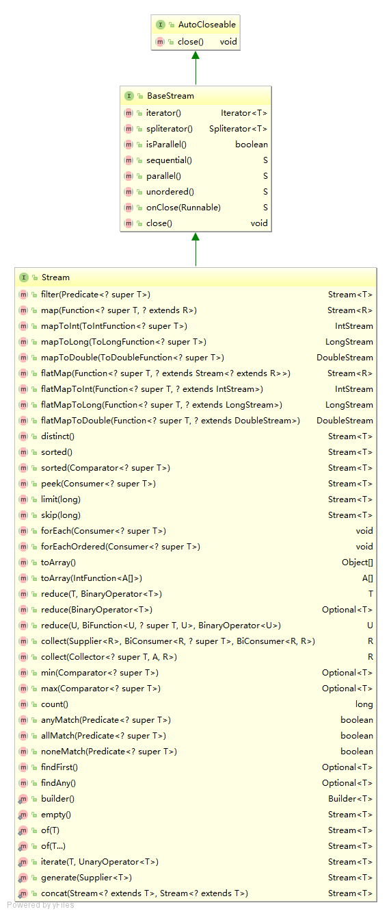 从上面的 UML 图可以看出来 BaseStream 接口是 Stream 流最基础的接口,它提供了所有流都可以使用的基本功能。 BaseStream 是一个泛型接口,它有两个类型参数 T 和 S , 其中 T 指定了流中的元素的类型, S 指定了具体流的类型,由 <S extends BaseStream<T,S>> 可以知道 S 必须为 BaseStream 或 BaseStream 子类,换句话说,就是 S 必须是扩展自 BaseStream 的。 BaseStream 继承了 AutoCloseable 接口,简化了关闭资源的操作,但是像平时我们操作的集合或数组,基本上都不会出现关闭流的情况。下面是 BaseStream 接口下定义的方法的相关解释:
