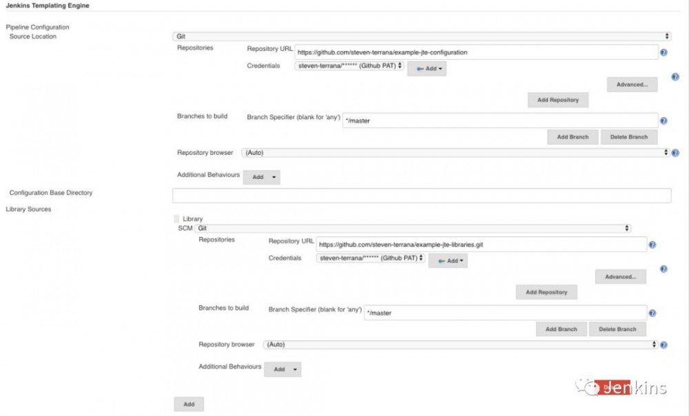 既然我们有了流水线配置存储库和库源存储库,那么就可以在 Jenkins 中配置治理层: