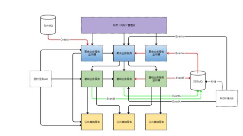 图上画了虚线框的都代表这个模块或项目是不包含太多业务逻辑的,纯粹是一层皮(会调用服务但是不会触碰数据库)。黑色线的箭头代表依赖关系,绿色和红色箭头分别是MQ的发送和订阅消息流的方向。具体在后文都会进一步详细说明。 如果你想和更多微服务技术专家交流,可以加我微信liyingjiese,备注『加群』。群里每周都有全球各大公司的最佳实践以及行业最新动态 。