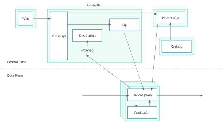 进出应用的 TCP 连接都被路由到 Linkerd 的数据平面(Linkerd-proxy),Linkerd 数据平面让这些流量可以被控制平面进行观测和管理。