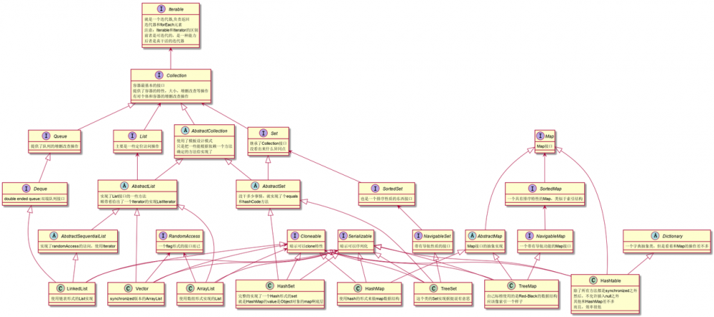 从上图可以看到,Collection和Map没有任何交集,他俩是分庭抗礼,毕竟表示的不是同一种类型的数据结构,但是,我在想啊,他们都是装东西,然后肯定还是可以抽象出来一些共同的东西:装了多少了,还能装多少,能装多少等等这种基本的操作,翻译成方法就是: