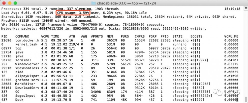 故障演练前系统的cpu状态,直接使用 top -o CPU 命令查看: