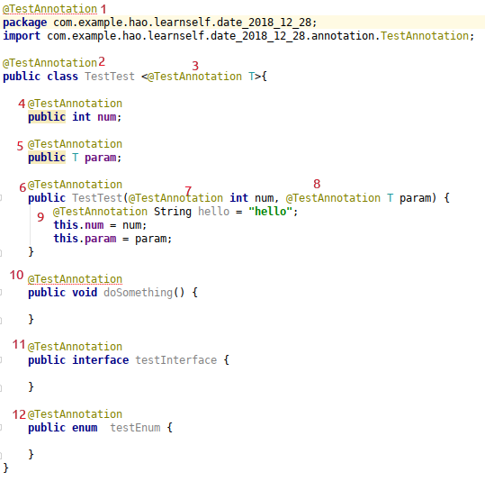 | ElementType.PACKAGE | 包类型,只能用于package-info.java文件中,位置对应图中的1,但是不能用于普通java文件 |