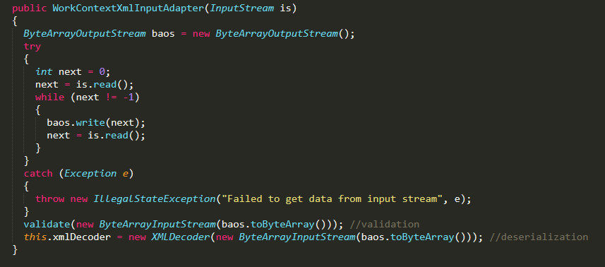 如上图所示,XMLDecoder 类用来反序列化上下文信息。XMLDecoder类是一个本不应该用于非可信输入的类。其他研究表明,该类允许任意方法和constructor对任意类型的调用。考虑到使用XMLDecoder的风险以及作为修复CVE-2017-3506漏洞的方法,在WorkContextXmlInputAdapter 中加入了一个validate() 函数来在反序列化之前过滤恶意标签。