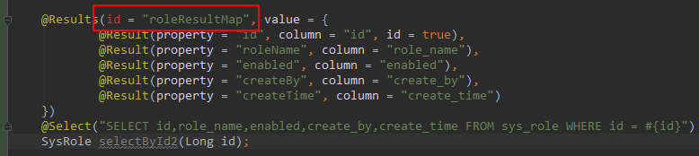 @Select("SELECT id,role_name roleName,enabled,create_by createBy,create_time createTime FROM sys_role WHERE id = #{id}")