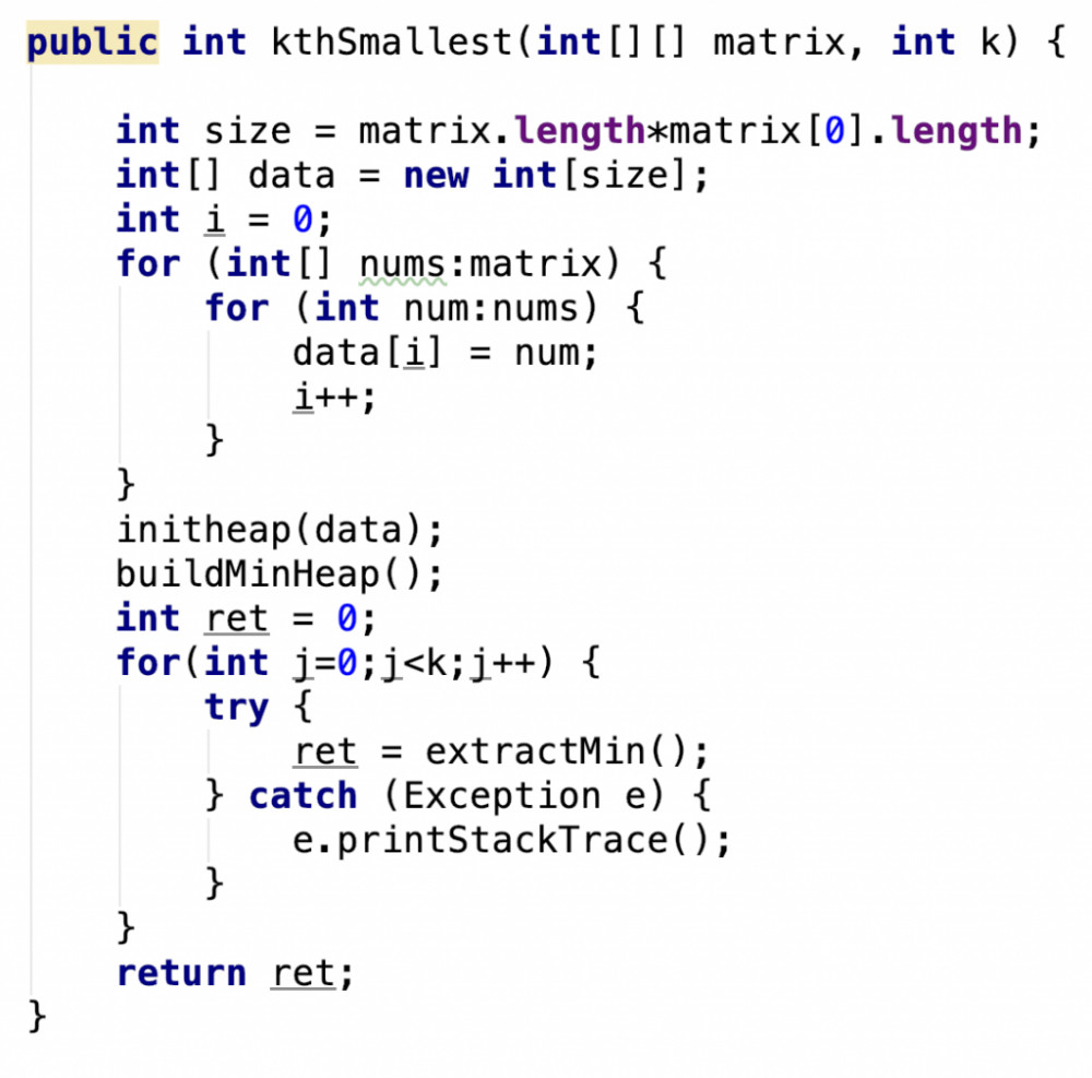 matrix = [ [ 1, 5, 9], [10, 11, 13], [12, 13, 15] ], k = 8, 返回 13. 注意,你可以假定k永远合法,1 ≤ k ≤ n<sup>2</sup>。 这道题明显可以有更精巧的做法,因为提供了一些矩阵的特性。但是我最近在做堆有关的题目,所以暂时只提供一个堆的解,很无耻就是把矩阵展开成数组,然后构建最小堆,然后得解。代码如下:(堆相关代码,参加前文)