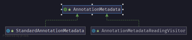 AnnotationMetadata 存在两个实现类分别为 StandardAnnotationMetadata 与 AnnotationMetadataReadingVisitor 。 StandardAnnotationMetadata 主要使用 Java 反射原理获取元数据,而 AnnotationMetadataReadingVisitor 使用 ASM 框架获取元数据。