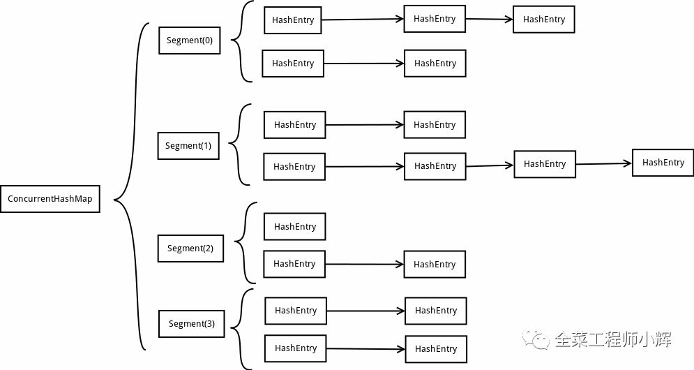 ConcurrentHashMap使用分段锁技术,将整个数据结构分段(默认为16段)进行存储,然后给每一段数据配一把锁(继承ReentrantLock),当一个线程占用锁访问其中一个段的数据的时候,其他段的数据仍然能被其他线程访问,能够实现真正的并发访问。 下图为JDK7的数据结构。