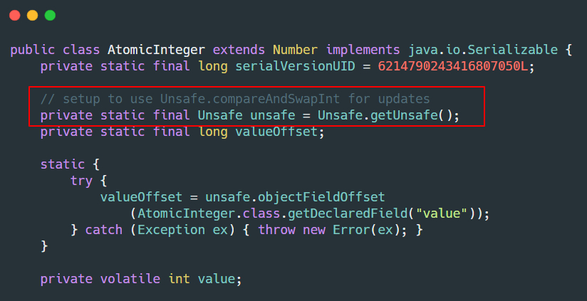 J.U.C 包里面的原子类 AtomicInteger 的方法调用了 Unsafe 类的 CAS 操作。