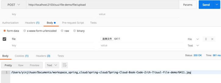 将服务注册到Eureka中,服务名称为zuul-file-demo,通过PostMan来上传文件,如图7-4所示