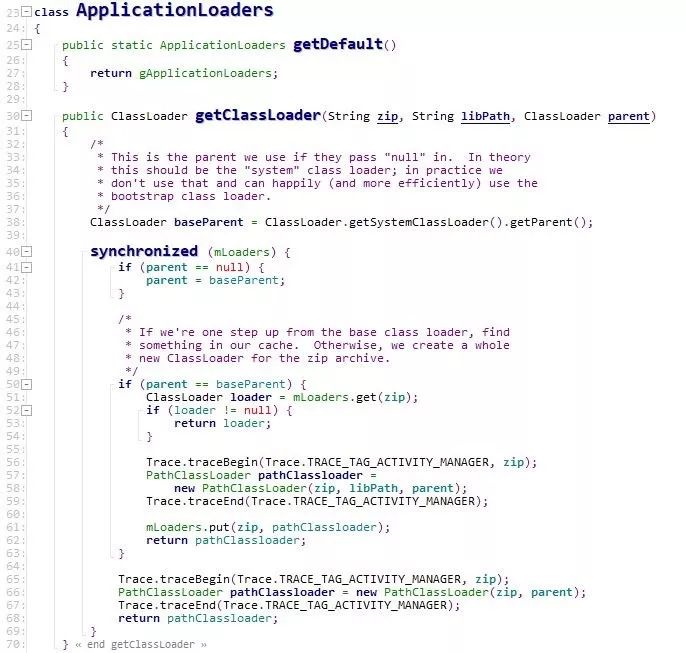 早期的大部分加壳都是保护真正的dex文件,虽然dex文件要经过优化,优化成odex,但我们依然说dex文件是dalvik虚拟机的可执行文件。每一个apk文件都对应着内存里的LoadedApk对象,这个对象里保存了类加载器。每一个LoadedApk对象通过ApplicationLoaders中的getClassLoader(下图第30行)来获取属于自己的类加载器。