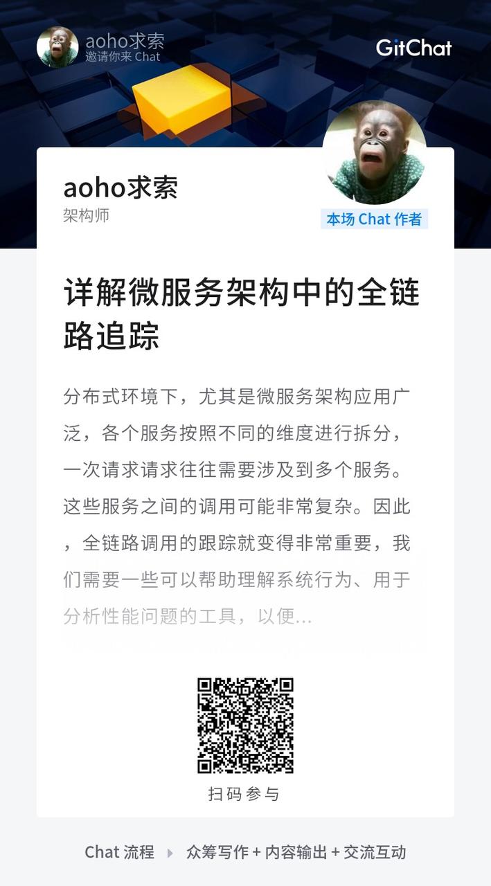 随着微服务架构的流行,请求涉及的调用链异常复杂,引入链路追踪组件便于排查问题。笔者在之前写了 几种分布式调用链监控组件的实践与比较 ,很多读者关注。在随后的实践中进行了更为深入了解,特此搞了一次 Chat 分享,介绍笔者的一些经验,希望能与大家交流。