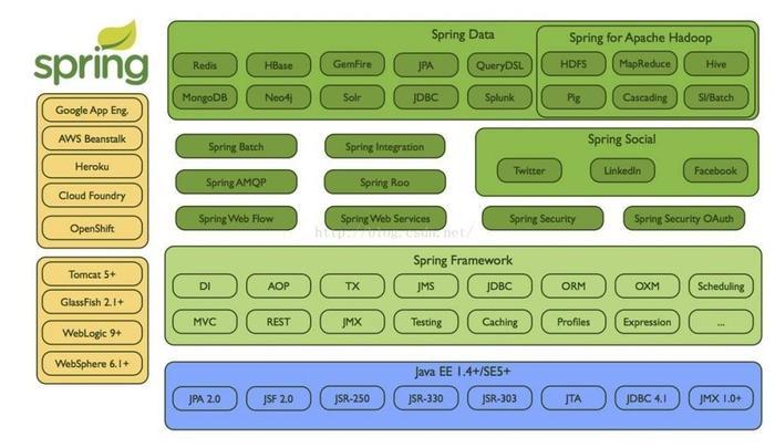 Spring Framework:即通常所说的Spring框架,是一个开源的Java/Java EE全功能栈应用程序框架,其它Spring项目如Spring Boot也依赖于此框架。