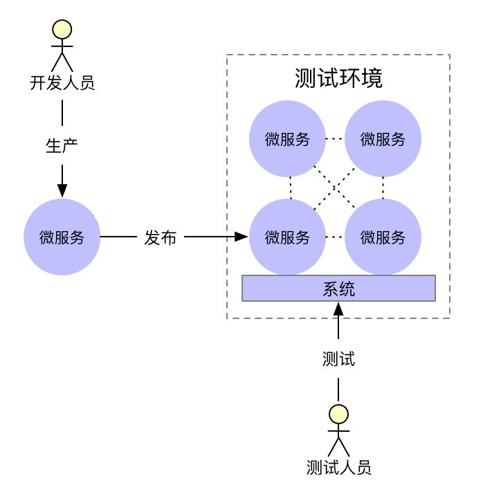 众所周知, 分布式系统是由众多微服务构成,并按照功能模块划分后, 由不同的开发小组进行维护. 研发模型如下图所示: 开发人员完成某一个微服务的功能后, 发布测试环境交付测试团队验证. 这种工作模式的弊端是, Bug在测试环境才被暴露, 而不是在编码阶段就被发现.