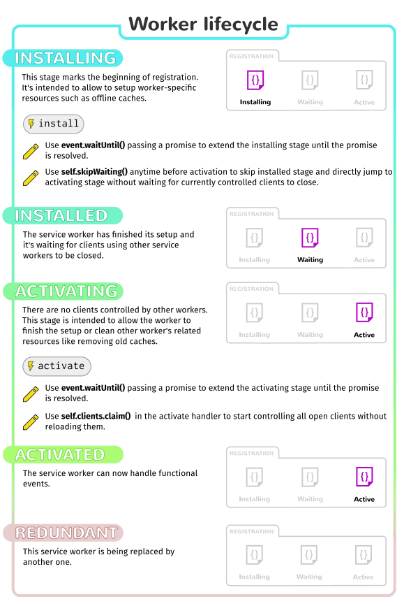 按照一篇文章的一贯节奏,到这个该深入的阶段,阅读体验往往突然变差,为了避免这种情况,不得不提的Service Worker生命周期话题,推荐大家去其它地方阅读,这种文章已经很多了,本文作者认为,此处可以写但没必要,并且没有信心写得比它们好,写了反而有抄袭凑字之嫌,所以在此仅仅贴出MDN的图,并简单总结(微笑)。