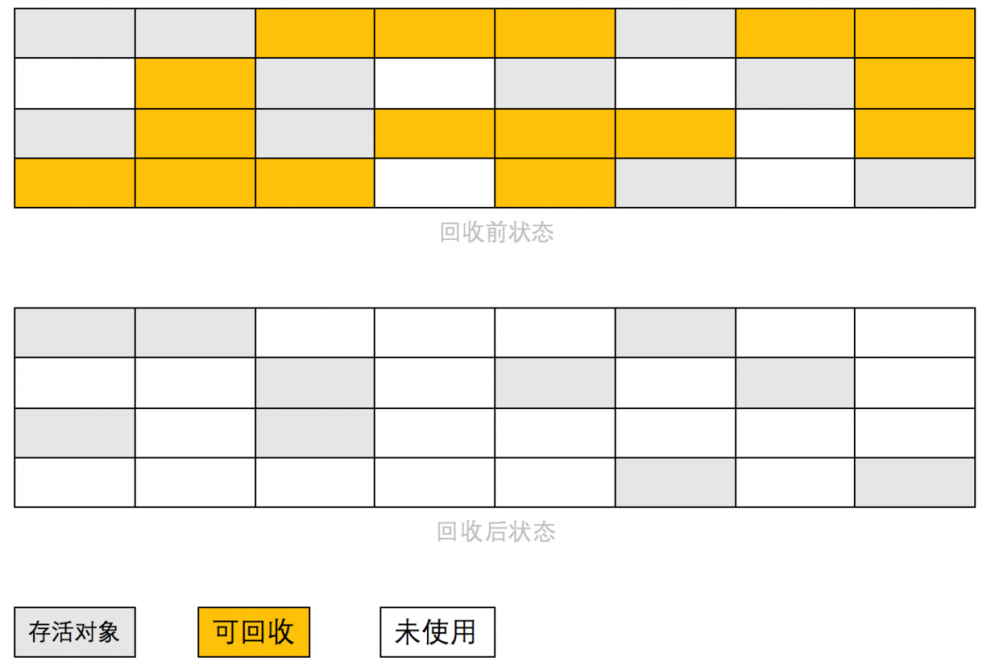第一阶段:标记出存活对象 第二阶段:存活对象往一端移动,清理边界外内存
