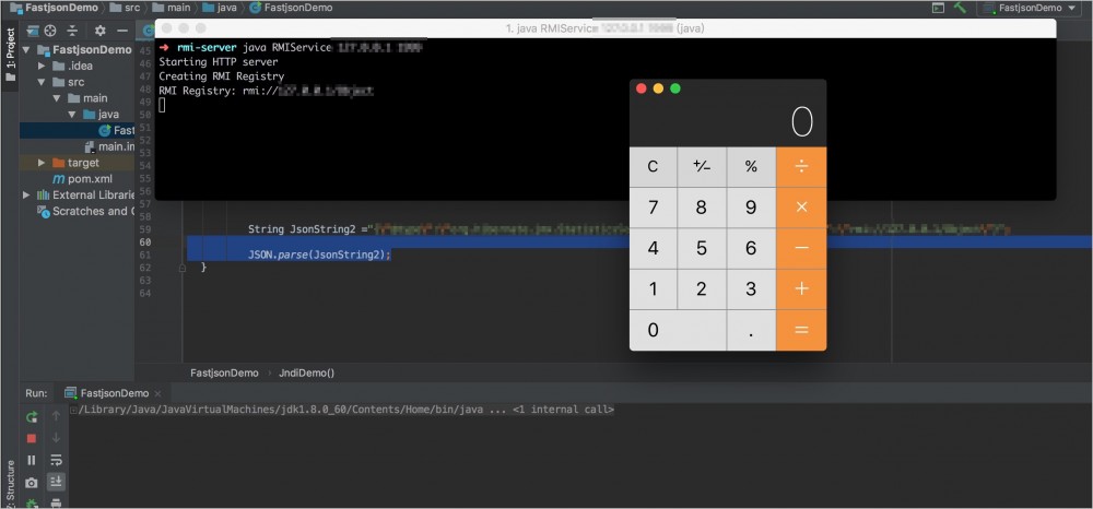 利用该0day漏洞,恶意攻击者可以构造攻击请求绕过FastJSON的黑名单策略。例如,攻击者通过精心构造的请求,远程让服务端执行指定命令(以下示例中成功运行计算器程序)。