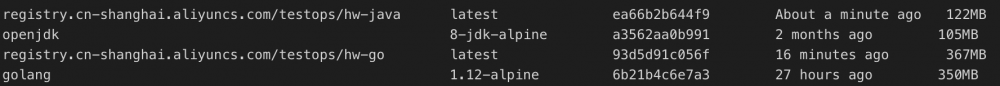 可以看出: golang:1.12-alpine 的镜像尺寸要比 openjdk:8-jdk-alpine 大不少,这也导致最后制作出来的