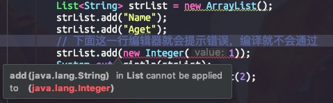 借助泛型,可以事先指定 List 中的元素类型,这样编译器在编译阶段就能够发现上面的问题: