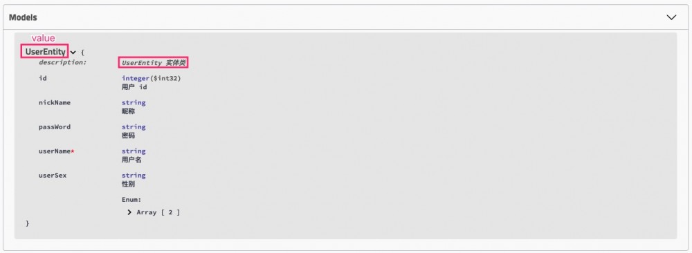 value :Model 展示时的名称,默认是 实体类的名称,比如 UserEntity ; description :实体类的描述