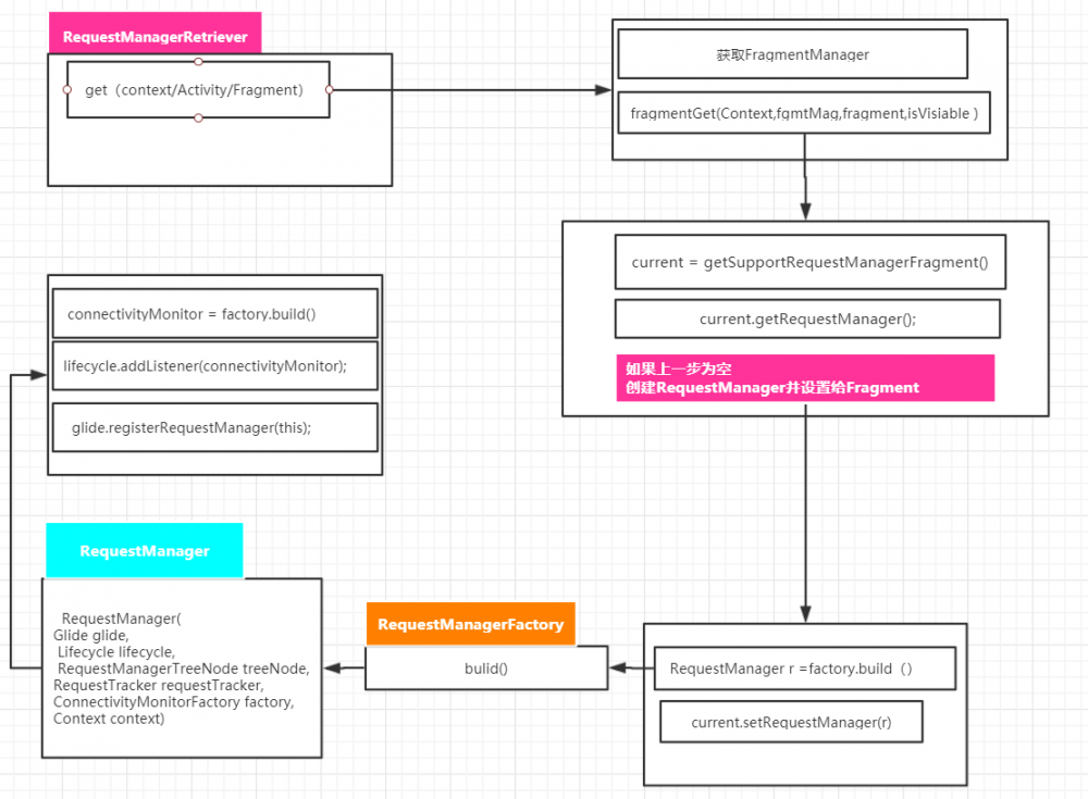 代码1和代码2被调用假设当前的activity还没有RequestManagerFragemnt,必然就会执行去创建的流程,代码1执行到了 pendingSupportRequestManagerFragments.put(fm, current);异步去添加,也就是使用handler将整个添加操作包装成了Message发送到了主线程的Looper中的messageQueue中而不是立即执行会等到Looper.looper()中遍历到它然后交给他的handler去处理他。异步添加在RFM没有添加到Activity中的时候,然后代码2就执行了同样也Activity中没有RFM也会去创建,这样就会在同一Activity中有两个RequesManagerFragment就出事了,所以引入了pendingSupportRequestManagerFragments,保证不会有上述情况的发生。向Activity中添加RFM这个异步任务之后,向Handler发送移除从pendingSupportRequestManagerFragments移除,这样就保证,在添加成功之前,都能在pendingSupportRequestManagerFraments中获取到RFM。