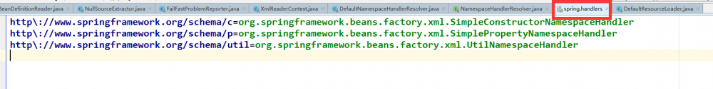 比如对于xmlns为http://www.springframework.org/schema/c的命名空间的处理器为org.springframework.beans.factory.xml.SimpleConstructorNamespaceHandler