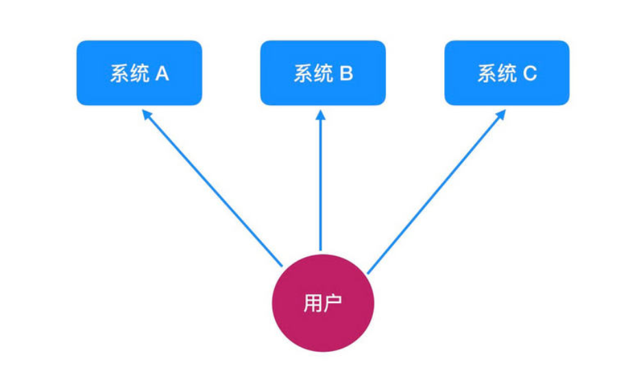 如下图所示,假设我们有三个业务子系统,用户如果要使用三个系统中的不同功能,他就需要同时在三个系统中登录然后来回切换进行操作。