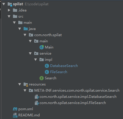 如你所见, SPI机制已经定义好了加载服务的流程框架, 你只需要按照约定, 在META-INF/services目录下面, 以接口的全限定名称为名创建一个文件夹(com.north.spilat.service.Search), 文件夹下再放具体的实现类的全限定名称(com.north.spilat.service.impl.DatabaseSearch), 系统就能根据这些文件,加载不同的实现类.这就是SPI的大体流程.