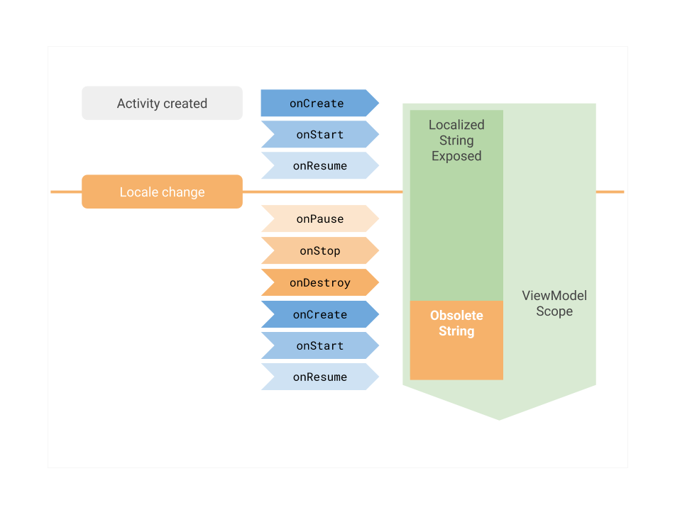 在 ViewModel 中,如果要公开来自资源(字符串、可绘制文件、颜色……)的数据,则必须着重考虑 ViewModel 对象而忽视配置更改,例如 区域设置更改 。当用户更改其区域设置时,活动将重新被创建,但不创建 ViewModel 对象。